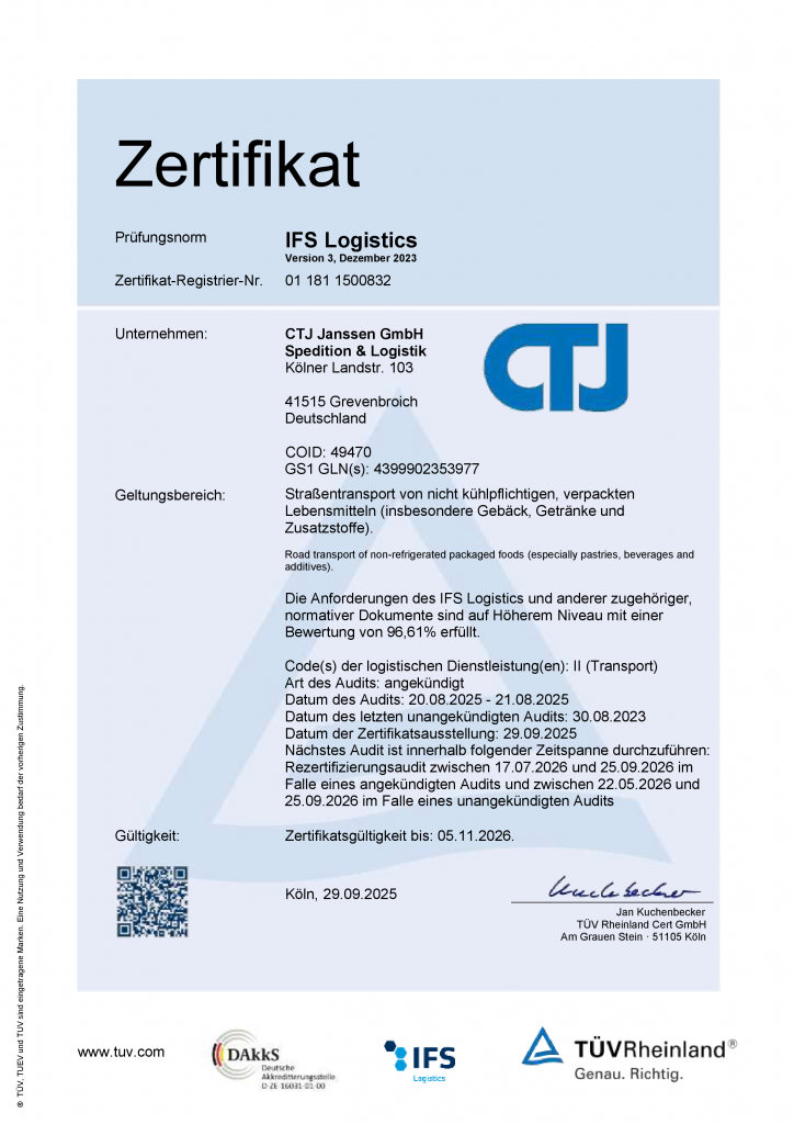 Erneut hat sich CTJ im August 2025 der Zertifizierung nach IFS Logistics 2.3 unterzogen. Mit dieser Auszeichnung garantiert CTJ seinen Kunden aus der Lebensmittelindustrie einen professionellen und hygienisch einwandfreien Transport ihrer Produkte.